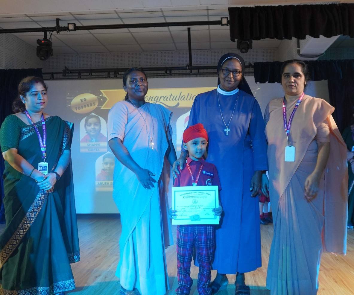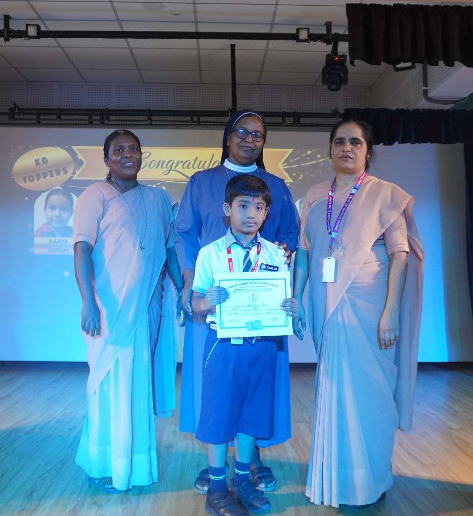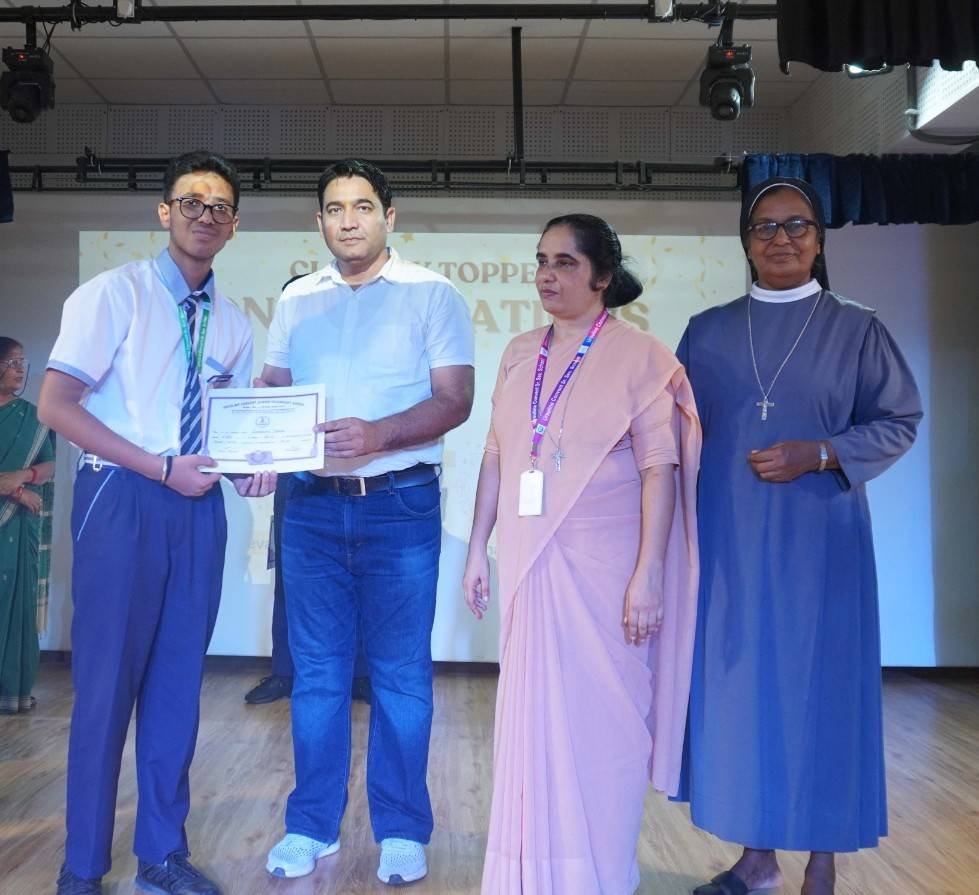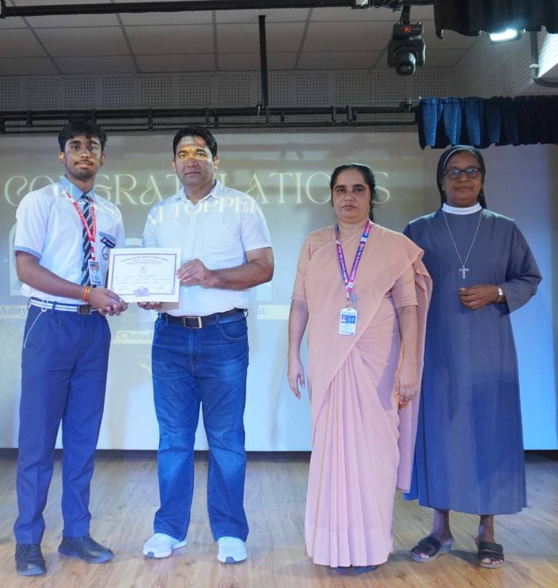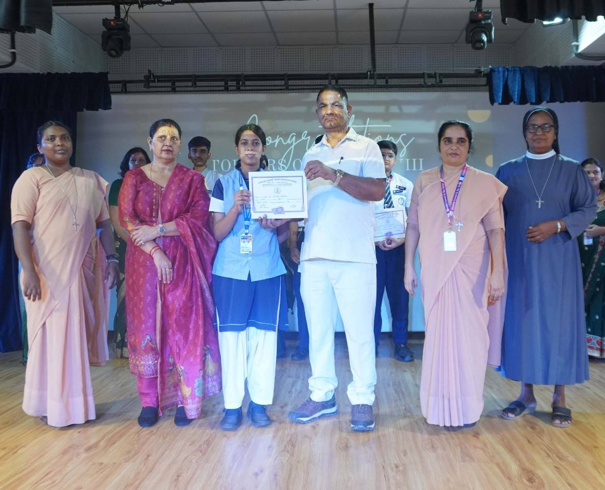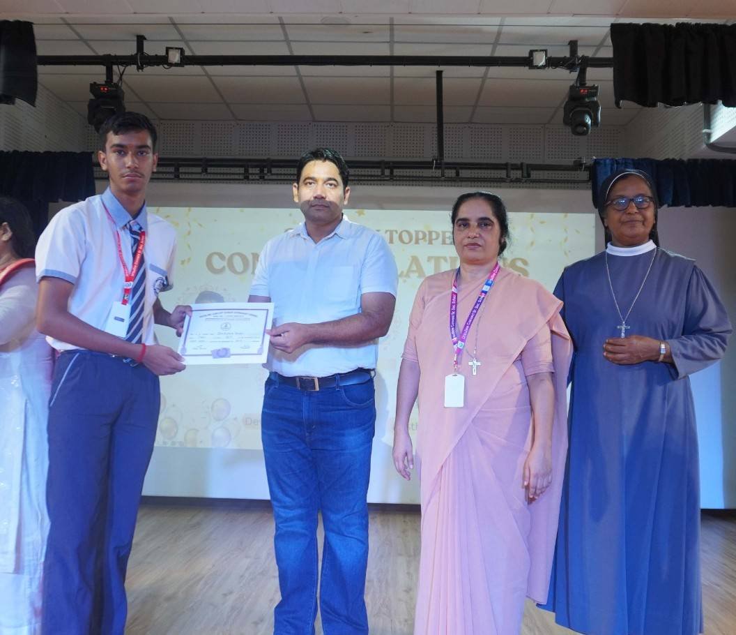 “A Celebration of Dreams, Dedication, and Deep Pride” “Success is not just about what you accomplish in life, but what you inspire others to do.” Our Valedictory Function echoed this truth in every moment, celebrating not just academic scores, but the spirit, sincerity, and silent perseverance behind them. Students from Nursery to Class XII were part of this proud occasion, the class-wise toppers were honoured for their staunch dedication. A moment of special honour was the presence of our Chief Guests, Mr. Devender and Mrs. Hemlata Bansal, proud parents of Mihir Bansal. The ceremony glowed brighter as we celebrated our school toppers—Mihir Bansal of Class XII, who achieved a remarkable 98.8%, and Yugank of Class X, who stood tall with an extraordinary 99%. These names were more than just figures of merit; they were stories of grit, consistency, and quiet brilliance. Adding to the spirit of gratitude, the teachers of Classes X and XII, whose students scored a perfect 100% in individual subjects, were also felicitated—honouring the guiding hands behind every shining child. The awards were graciously presented by Reverend Sister Anu George, our School Manager; Reverend Sister Rekha, our Principal; and Sister Mamitha, our devoted Office Administrator. More than a ceremony, it was a reflection of the school’s soul—where potential is nurtured, dreams are ignited, and every milestone becomes a memory.