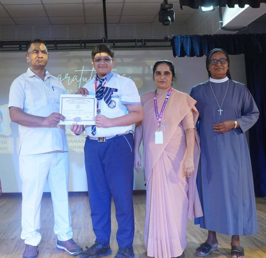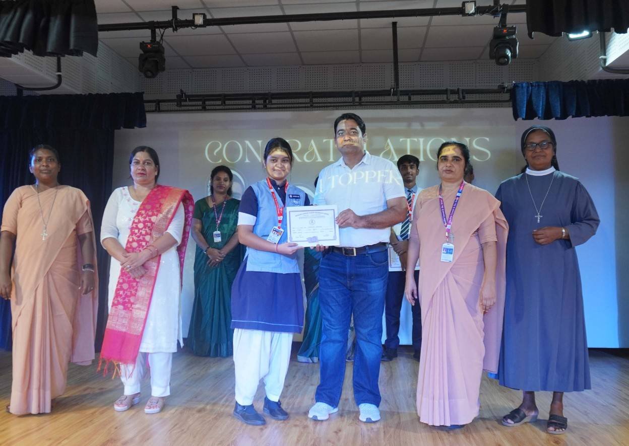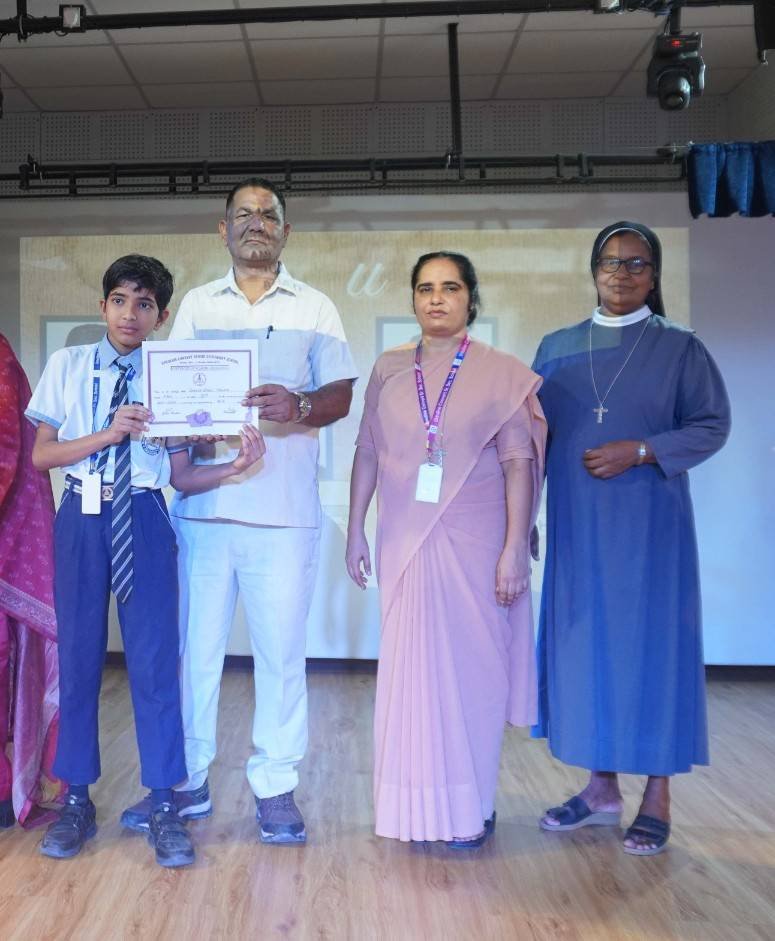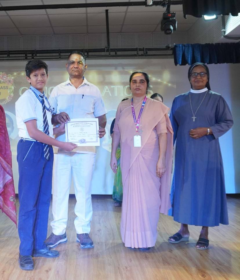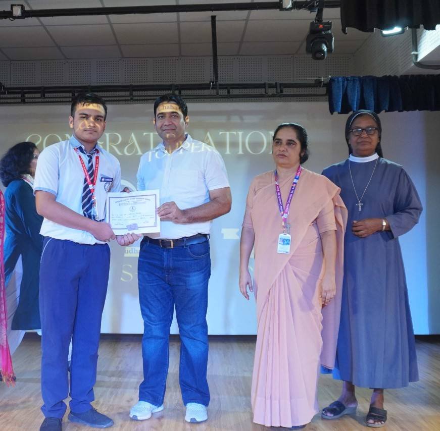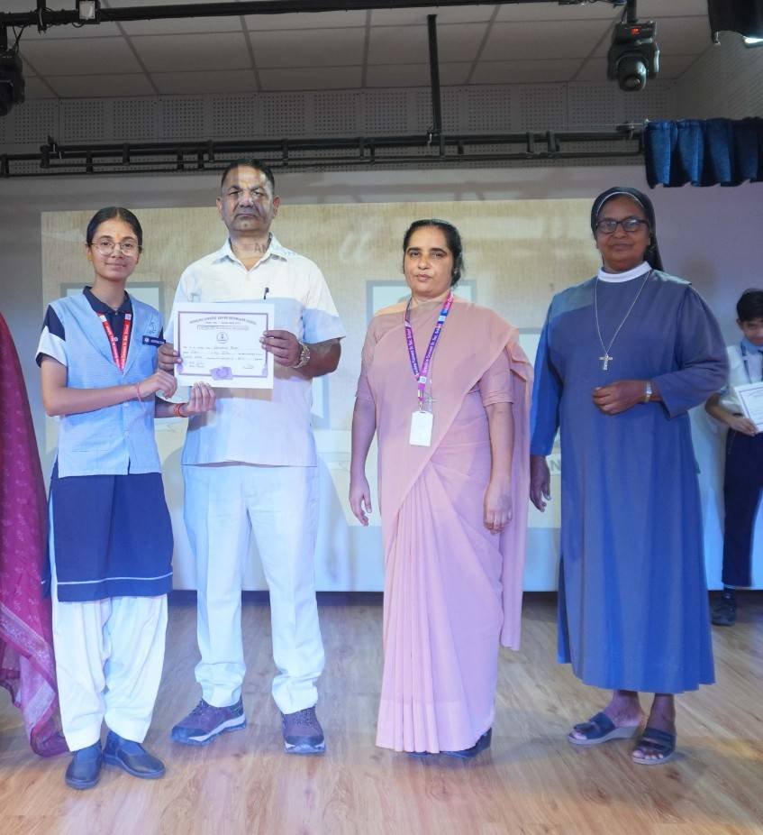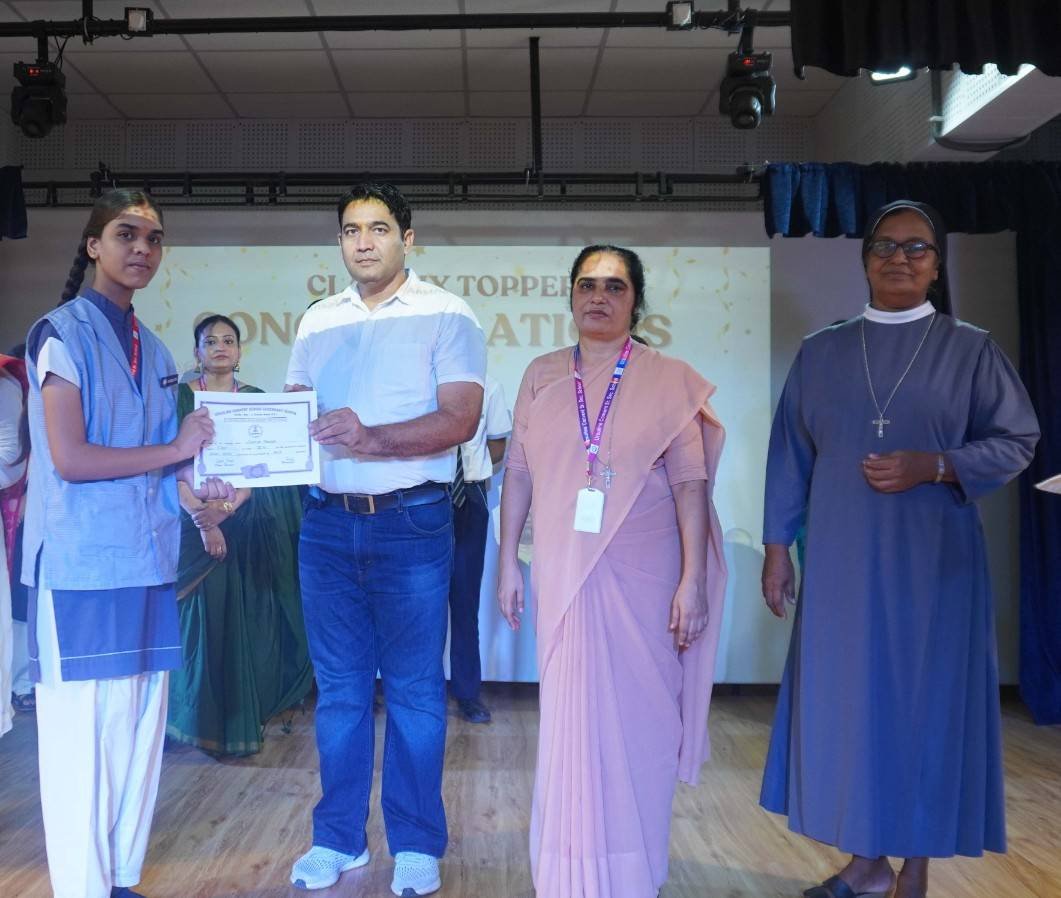 “A Celebration of Dreams, Dedication, and Deep Pride” “Success is not just about what you accomplish in life, but what you inspire others to do.” Our Valedictory Function echoed this truth in every moment, celebrating not just academic scores, but the spirit, sincerity, and silent perseverance behind them. Students from Nursery to Class XII were part of this proud occasion, the class-wise toppers were honoured for their staunch dedication. A moment of special honour was the presence of our Chief Guests, Mr. Devender and Mrs. Hemlata Bansal, proud parents of Mihir Bansal. The ceremony glowed brighter as we celebrated our school toppers—Mihir Bansal of Class XII, who achieved a remarkable 98.8%, and Yugank of Class X, who stood tall with an extraordinary 99%. These names were more than just figures of merit; they were stories of grit, consistency, and quiet brilliance. Adding to the spirit of gratitude, the teachers of Classes X and XII, whose students scored a perfect 100% in individual subjects, were also felicitated—honouring the guiding hands behind every shining child. The awards were graciously presented by Reverend Sister Anu George, our School Manager; Reverend Sister Rekha, our Principal; and Sister Mamitha, our devoted Office Administrator. More than a ceremony, it was a reflection of the school’s soul—where potential is nurtured, dreams are ignited, and every milestone becomes a memory.