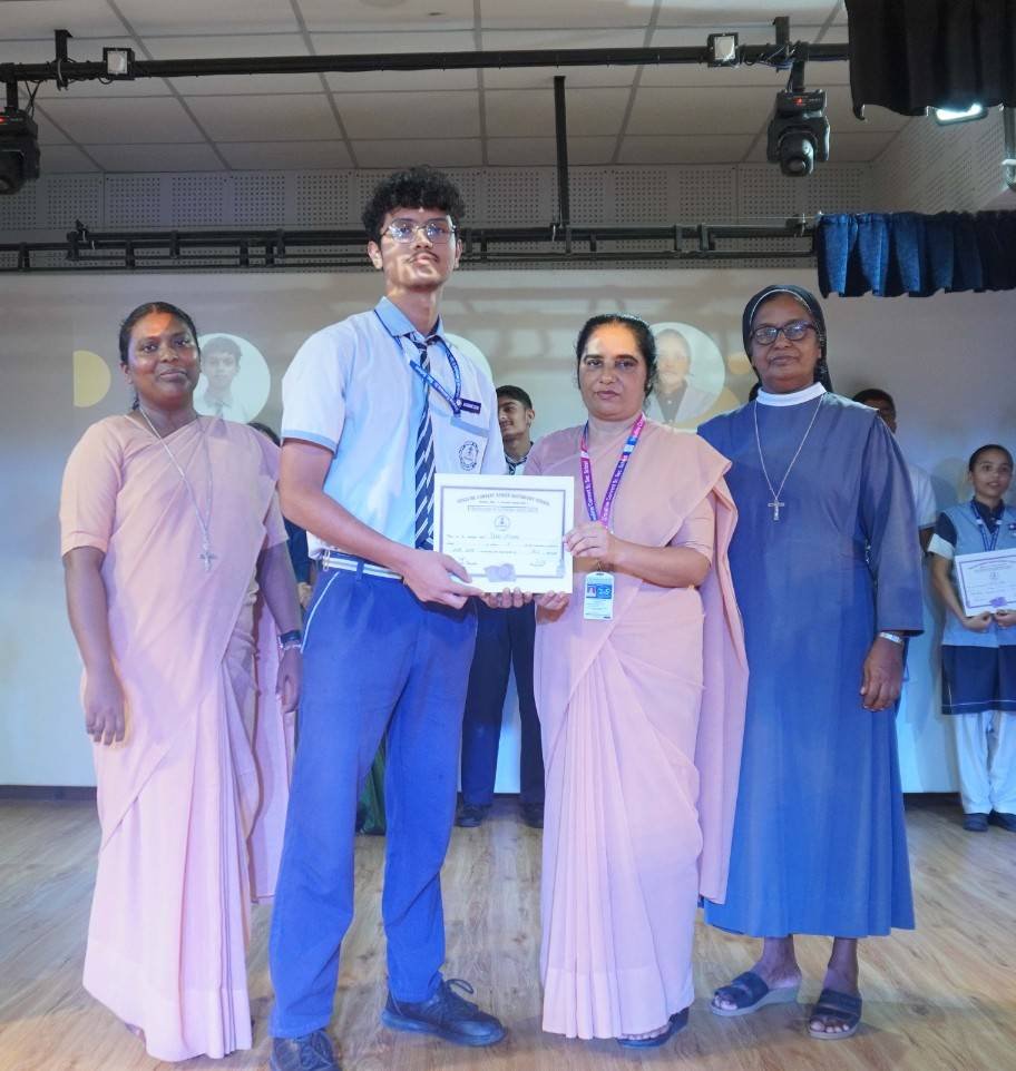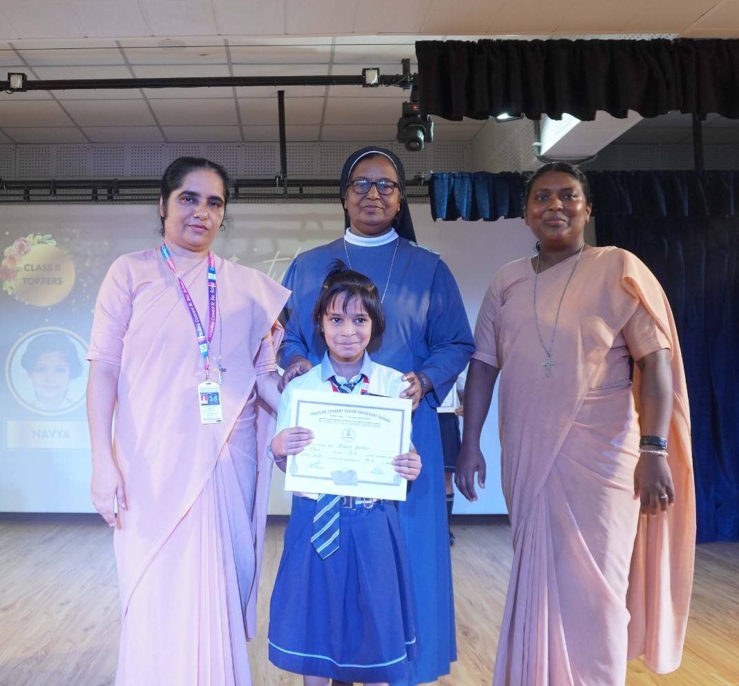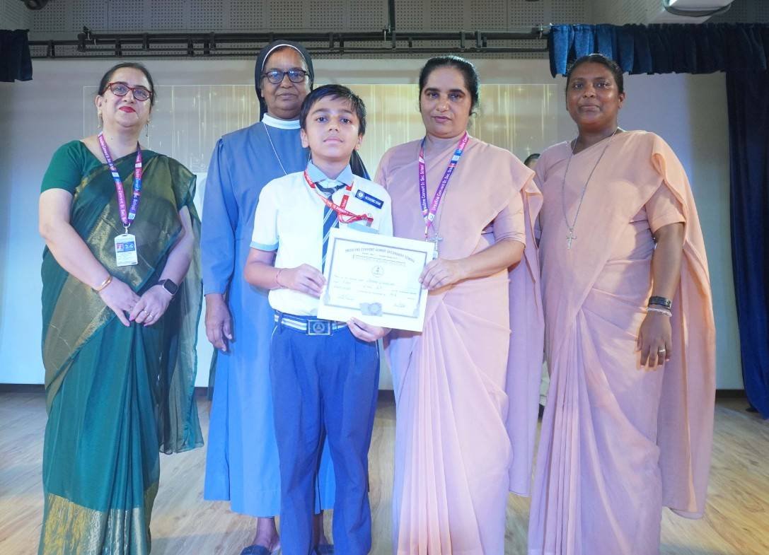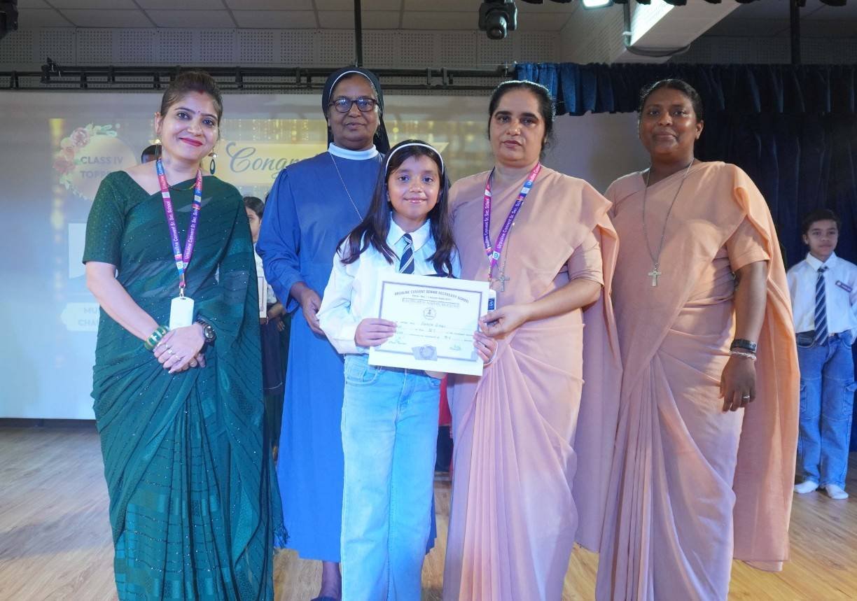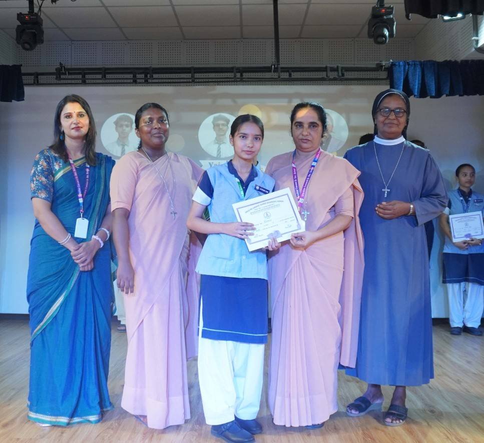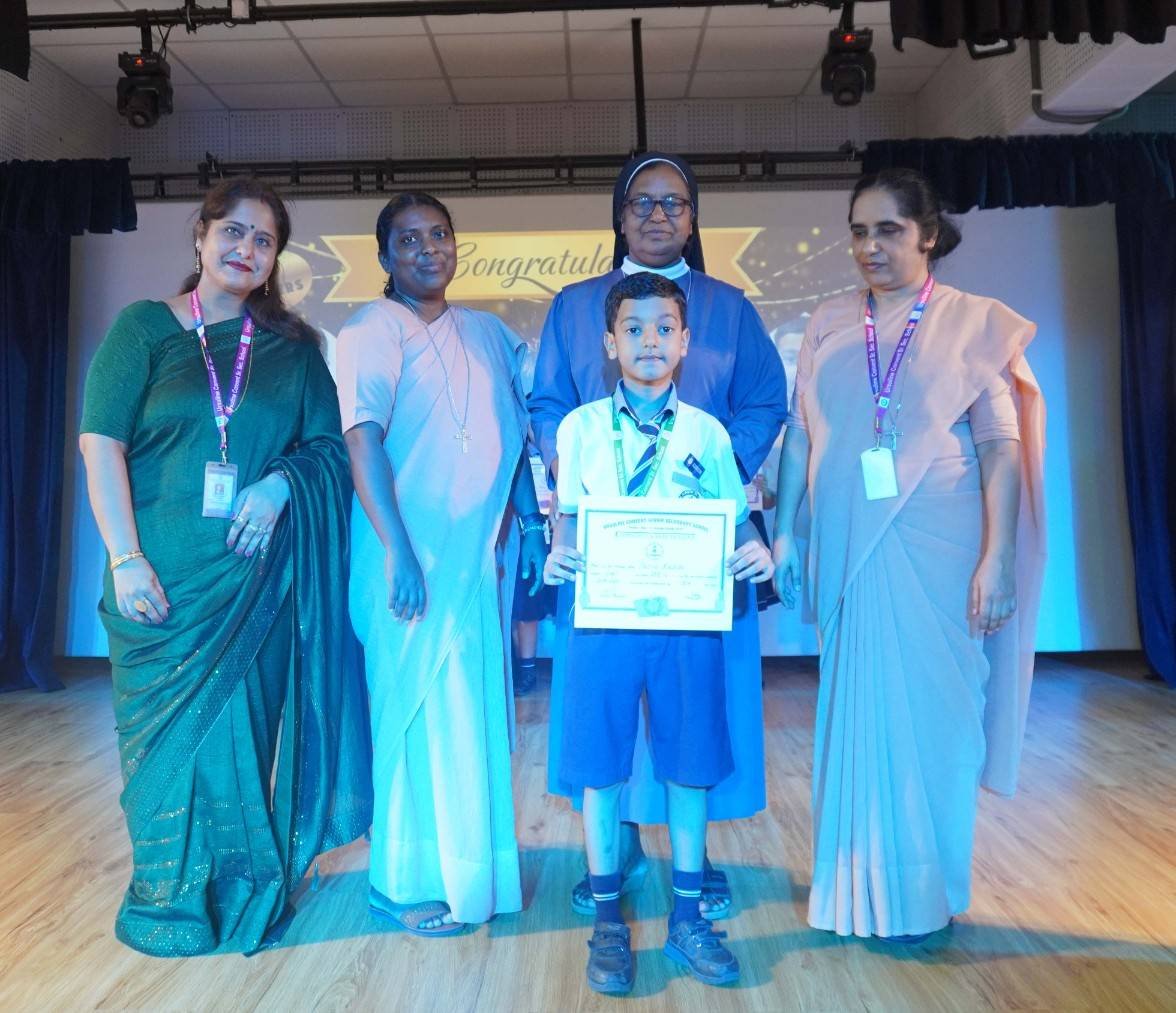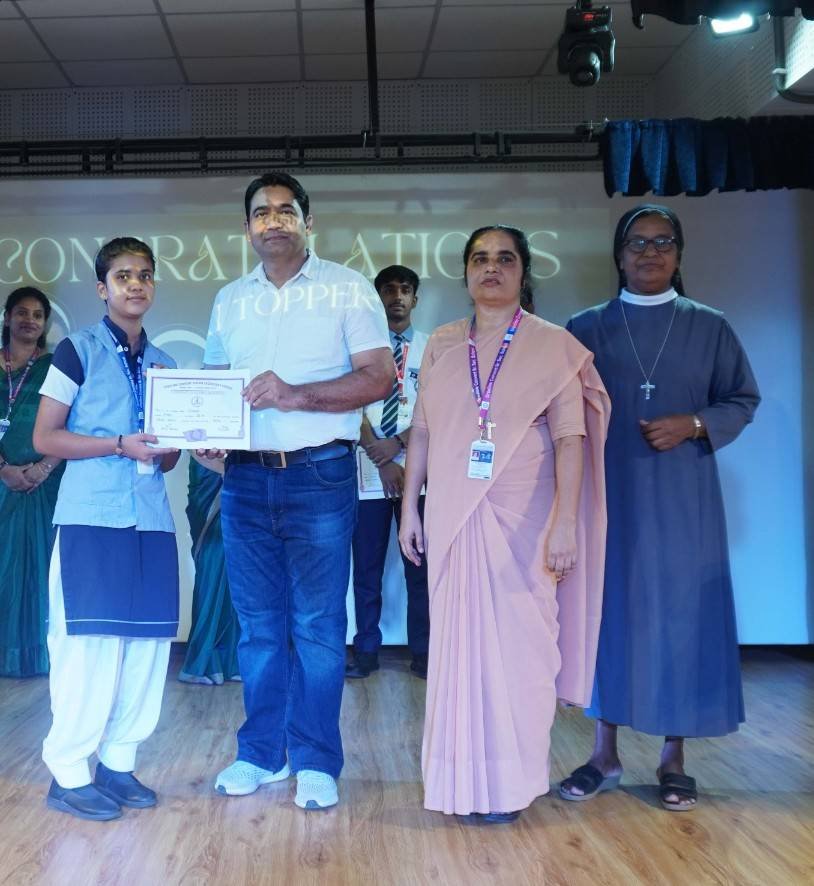 “A Celebration of Dreams, Dedication, and Deep Pride” “Success is not just about what you accomplish in life, but what you inspire others to do.” Our Valedictory Function echoed this truth in every moment, celebrating not just academic scores, but the spirit, sincerity, and silent perseverance behind them. Students from Nursery to Class XII were part of this proud occasion, the class-wise toppers were honoured for their staunch dedication. A moment of special honour was the presence of our Chief Guests, Mr. Devender and Mrs. Hemlata Bansal, proud parents of Mihir Bansal. The ceremony glowed brighter as we celebrated our school toppers—Mihir Bansal of Class XII, who achieved a remarkable 98.8%, and Yugank of Class X, who stood tall with an extraordinary 99%. These names were more than just figures of merit; they were stories of grit, consistency, and quiet brilliance. Adding to the spirit of gratitude, the teachers of Classes X and XII, whose students scored a perfect 100% in individual subjects, were also felicitated—honouring the guiding hands behind every shining child. The awards were graciously presented by Reverend Sister Anu George, our School Manager; Reverend Sister Rekha, our Principal; and Sister Mamitha, our devoted Office Administrator. More than a ceremony, it was a reflection of the school’s soul—where potential is nurtured, dreams are ignited, and every milestone becomes a memory.